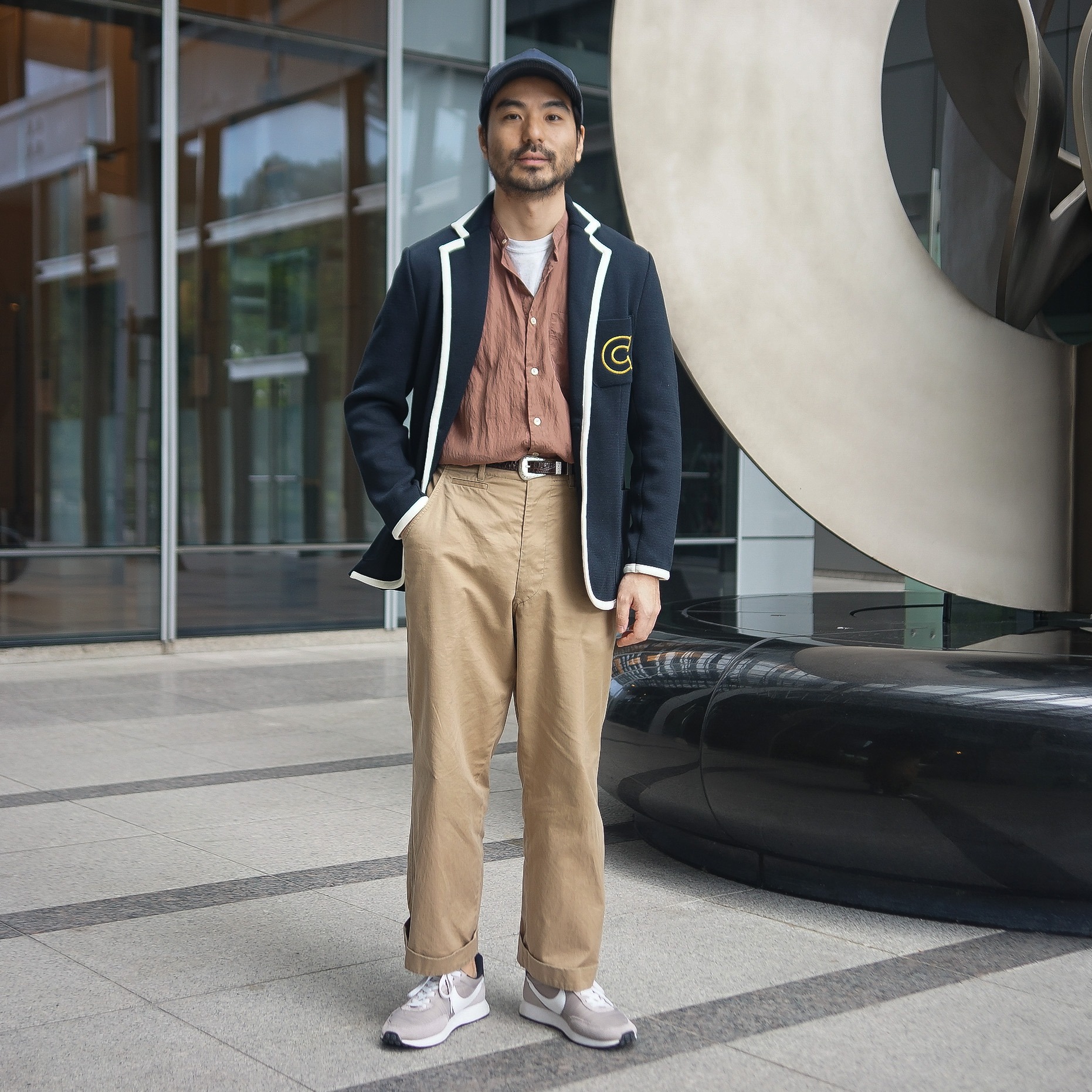IVYスタイルを、CAMOSHITAの独特な素材のバンドカラーシャツや足元のNIKE Tailwind でアップデート。
