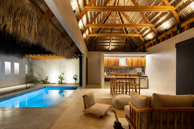 コスタリカのセカンドハウス。リビングの壁は必要ないと思ったので省き、キッチンも大きなものは必要ないと考え、最低限のコンパクトなもの。それが自分にフィットしていて使いやすくて心地がいいという。